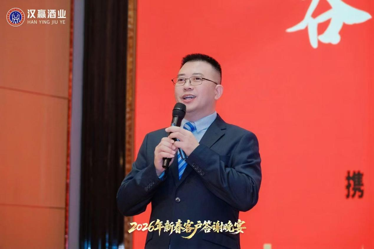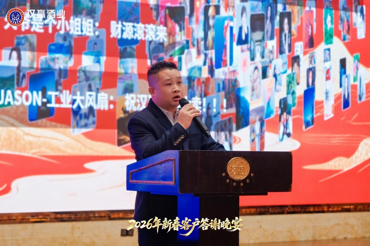 汉赢酒业董事长汪飞先生率先登台,向所有合作伙伴致以最诚挚的新春问候与感谢。回首2025,汪总指出,面对行业的深度调整,汉赢酒业始终坚守茅台镇核心产区的纯正血脉与古法坤沙工艺的匠心传承,将“品质是生命线”的信念深植于每一滴酒中。他表示,公司的每一步成长,都离不开在座伙伴在风浪中的坚定信任与鼎力支持。汉赢酒业致力于构建的,正是一个“品牌共建共同体”,一个彼此成就、命运与共的大家庭。